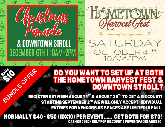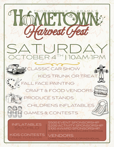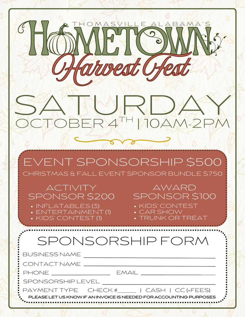 We are in need of local sponsors for our brand new event! We are constantly growing to bring more fun and activities to our Thomasville Community. Our events typically see 2500+ attendees so it is a great opportunity for advertising and exposure while also giving back to our community!