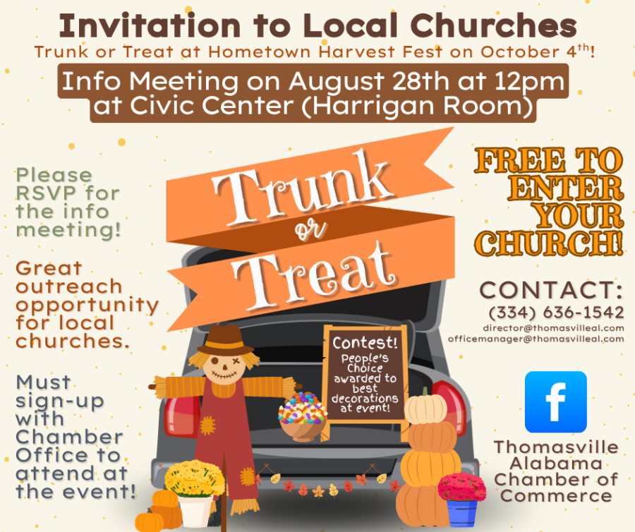 First ever Trunk or Treat at Hometown Harvest Fest for our LCOAL churches! This is a great opportunity to get involved with a community event and connect with kids in Thomaville and surrounding areas. It is FREE to sign up. Check out the Guidelines included below.